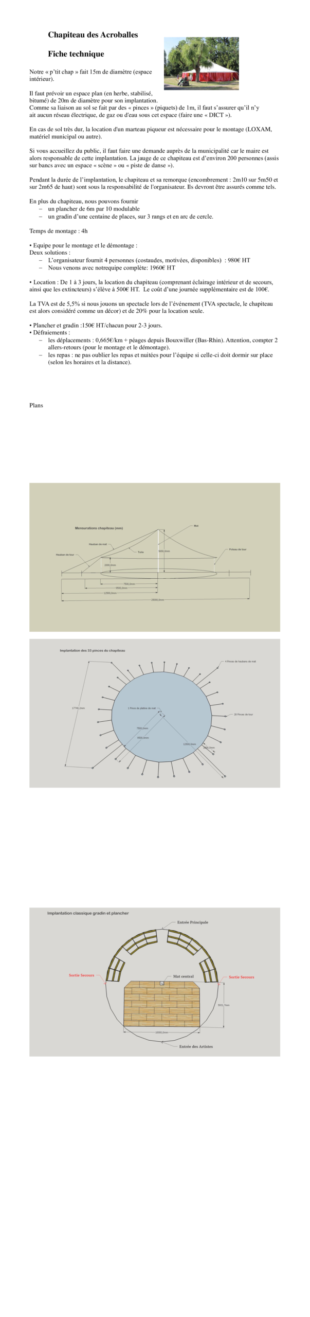 Notre chapiteau accueille des spectacles, concerts et expositions. Il peut également abriter tout type d’événement festif, du mariage à l’accueil de festival. Notre matériel est homologué et régulièrement vérifié par le BVCTS. Équipé des éléments nécessaires à la sécurité (éclairage de secours, extincteurs), il offre un espace convivial et sécurisé pour accueillir votre public. Nous pouvons vous fournir sur demande du matériel supplémentaire, gradins ou plancher. N’hésitez pas à nous contacter pour plus de renseignements.